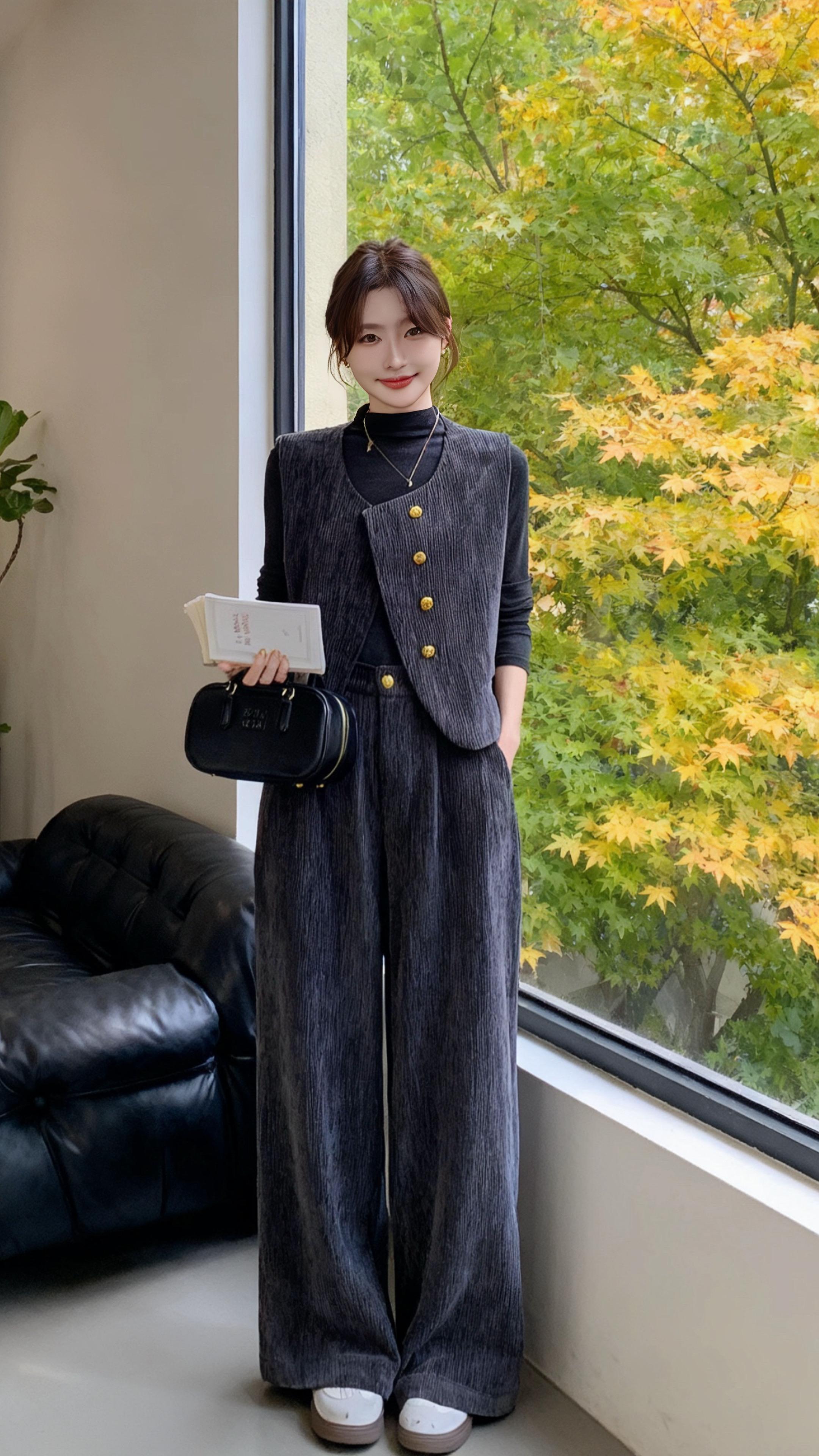 #高级感穿搭#慵懒风穿搭#早秋高智感 职场穿搭#被秋日氛围感穿搭拿捏了#早 秋贵气感穿搭,轻熟风简约通勤套装,女2025春秋新款复古老钱风马甲打底衫阔腿裤